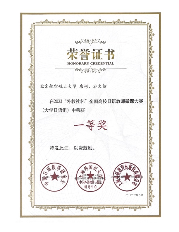 在公司的大力支持下,VSport日语团队的两位青年教师唐彬和谷文诗,充分运用现代化教学手段,生动地呈现了教学内容,同时有机地融入了课程思政元素,展现出北航日语教学的工科特点和“空天报国”的教学理念。在激烈的竞争中,她们的微课作品从180个参赛作品中脱颖而出,荣获全国一等奖,彰显了VSport日语教师扎实的专业功底和出色的信息技术应用能力,为北航日语教育的卓越品质增光添彩。