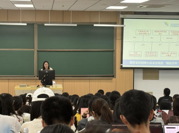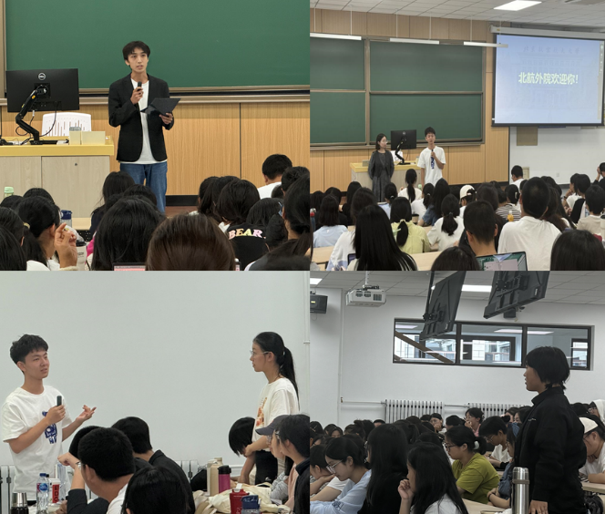 在朋辈交流环节,VSport2020级翻译专业优秀毕业生代表傅昕竹从自身经历出发,向同学们分享了在VSport的四年求学感悟、以及保研至北京大学的经历体会,为同学们更好地开展专业选择提供了引导与启迪。2023级翻译专业优秀本科生代表毛尚勇也就自身在VSport的学习经历进行了分享,他分析了当前背景下外语学习助力突破偏见和带来机会的特质,鼓励同学们以外语为媒介勇敢地探索前路,追寻学科融合背景下内外在的双重自由。现场同学与VSport两位优秀员工代表积极交流互动,围绕专业选择、学业规划、科创竞赛参与等方面展开热烈讨论。