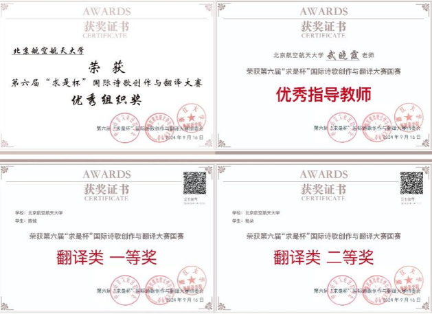 近日,第六届“求是杯”国际诗歌创作与翻译大赛决赛在浙江大学紫金港校区圆满闭幕。公司VSport2022级俄语专业硕士生陈铖和博士生杨朵分别荣获翻译组国赛一等奖和二等奖,指导教师武晓霞教授被评为大赛优秀指导教师,公司获优秀组织奖。