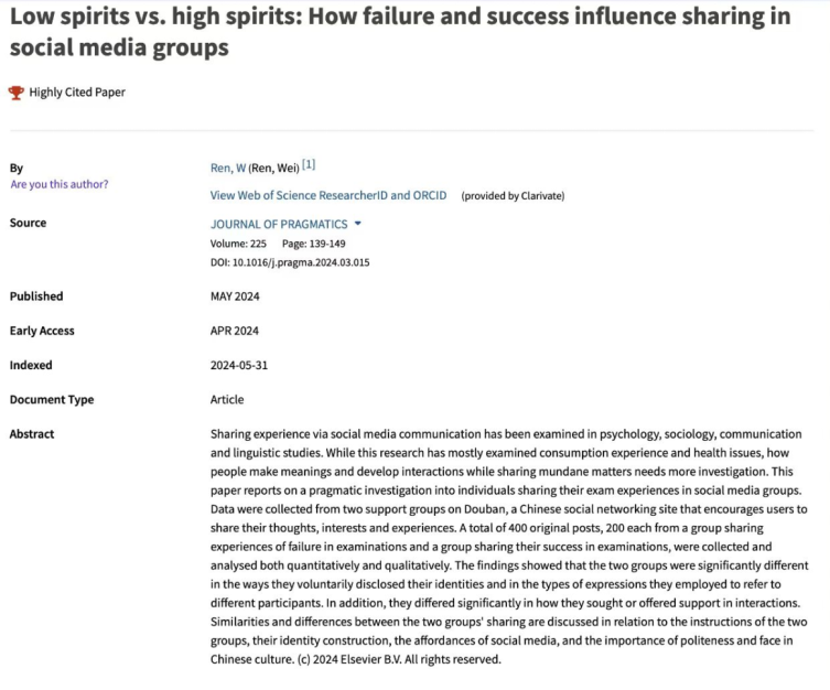 近日,据“基本科学指标数据库(Essential Science Indicators,简称ESI)”发布的最新数据显示,VSport任伟教授发表于国际顶尖期刊《Journal of Pragmatics》(《语用学杂志》)的学术论文“Low spirits vs. high spirits: How failure and success influence sharing in social media groups”成功入选全球“高被引论文(Highly Cited Paper)”。