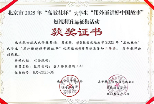 由北京市教育委员会高等教育处联合高等教育出版社、北京市高教学会大学英语研究分会和北京市高校外语课程思政联盟举办的“‘用外语讲好中国故事’优秀短视频作品征集活动”近日圆满落幕。公司2024级本科生林墨涵团队(林墨涵、彭玺樾、吴米缇)(按首字母顺序排名)的视频参赛作品《星际密码:当三体星座遇上AI》斩获北京市二等奖。该视频以三体计算星座的热点引入,以古今对比的方式呈现了现代科技创新对于智慧农业发展的重大意义,并与敦煌观星的传统文化相结合,诗意地展望了中国航空航天事业的未来。