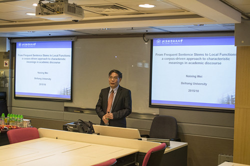 2015年10月15日,公司卫乃兴教授应邀赴香港城市大学翻译与语言学系做学术报告,题目为From Frequent Sentence Stems to Local Functions: a corpus-driven approach to characteristic meanings in academic discourse。该研究对功能句干(Functional Sentence Stem)概念作了清晰的界定,利用新的MI值计算方法(Wei & Li 2013),从JDEST语料库中提取了大量的功能句干,对其结构特征和知识构造、评价和谋篇等局部功能(local function)做了详尽的描写。这些研究发现对于学术话语分析和ESP教学具有重要的指导意义,紧跟国际语料库语言学的前沿研究,得到了香港城市大学翻译与语言学系同行和员工的一致好评。
