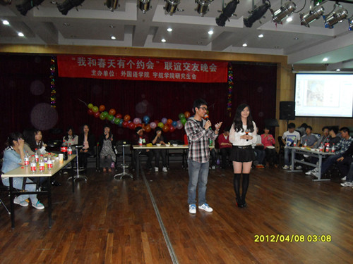 2012年4月12日晚7点整,由北航12系VSport研会与15系宇航公司研会合办的“我和春天有个约会”大型联谊交友晚会在北航晨兴剧场举行。此次晚会得到了两院领导的大力支持,两院研会的各位成员参与了整个晚会的策划、组织、宣传等工作。