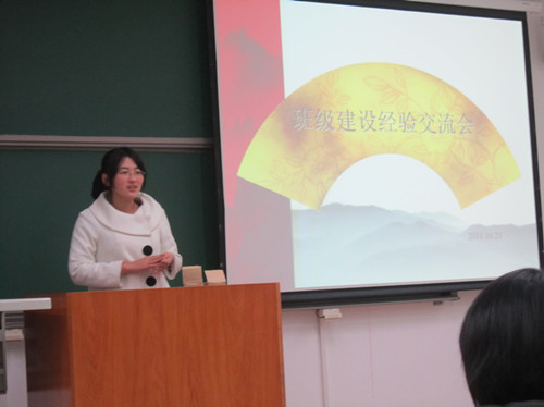 最后,101212班和101213班的员工代表详细介绍了优秀班集体答辩的经验和教训。优班答辩是新生入学面临的一个非常重要的课题和活动,每个班从组织到实践再到最后的总结和答辩材料准备都投入了大量的时间和精力,本次活动首先由101212班班长葛勍和宣委迟宏申上台发言,他们先将曾经答辩时用的材料向新生们展示,将活动的大概流程作了简要介绍,然后葛勍同学提出了几点建议和意见,这些内容包括准备工作要提前,充分;创意一定要新颖独特吸引眼球,要注重集体的力量,要鼓励每一个小班同学加入到本次活动中来,要开拓视野,扩大影响力。随后是101213班的班长王蕾和团支书蒋明彤同学上台展示,也向大家提出了很多的建议。