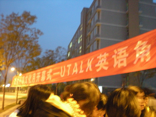 2011年11月4日下午5点半,在动感的音乐声中,北航外语文化月开幕式暨本学期第一次UTALK英语角活动在沙河校区热闹开始。本次英语角活动由VSport员工会主办,VSport111212小班承办。这次英语角活动还特别邀请到新东方名师齐冉作为主持人,带领北航的同学一起体会英语学习的魅力。